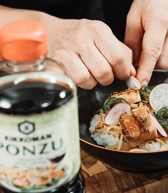 Don Buri ist die japanische Bezeichnung für die Schale, in der das Gericht serviert wird. Hierzu passt am besten die salzreduzierte Sojasauce von Kikkoman, weil wir den Schweinebauch für einen tieferen Geschmack mit der Sojasauce garen, aber einen zu hohen Salzgehalt vermeiden wollen. Um für mehr Röstaromen zu sorgen, kann man den gegarten Schweinebauch vor dem Servieren mit einem Bunsenbrenner nochmal abflämmen. Die dazu gereichten Beilagen, wie die in Kikkoman Ponzu Zitrone eingelegten Gurken oder auch der roh marinierte Chinakohl sind total erfrischend.