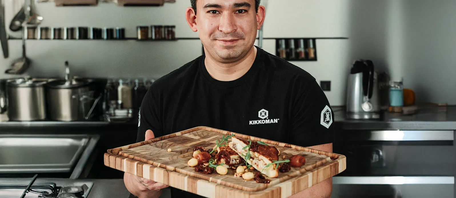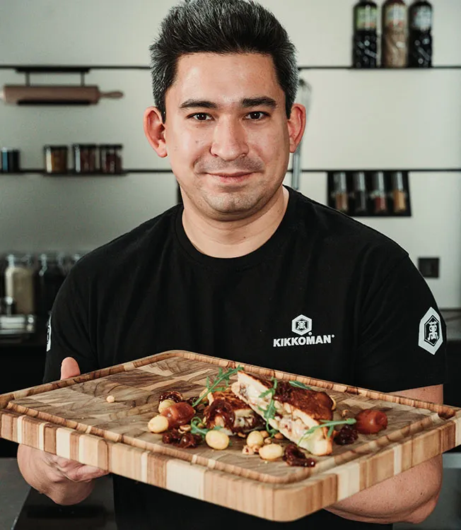 Das Besondere an diesem Gericht ist unter anderem, dass wir die Bechamel-Sauce mit Kikkoman Sojasauce abschmecken, anstatt Salz zu nehmen. Haselnüsse bringen knackigen Biss, die „Umeboshi“ (japanischen eingelegten Salzpflaumen) sorgen für das Säure-Salz-Spiel und die karamellisierten Zwiebeln harmonieren herrlich mit den drei Käsesorten.