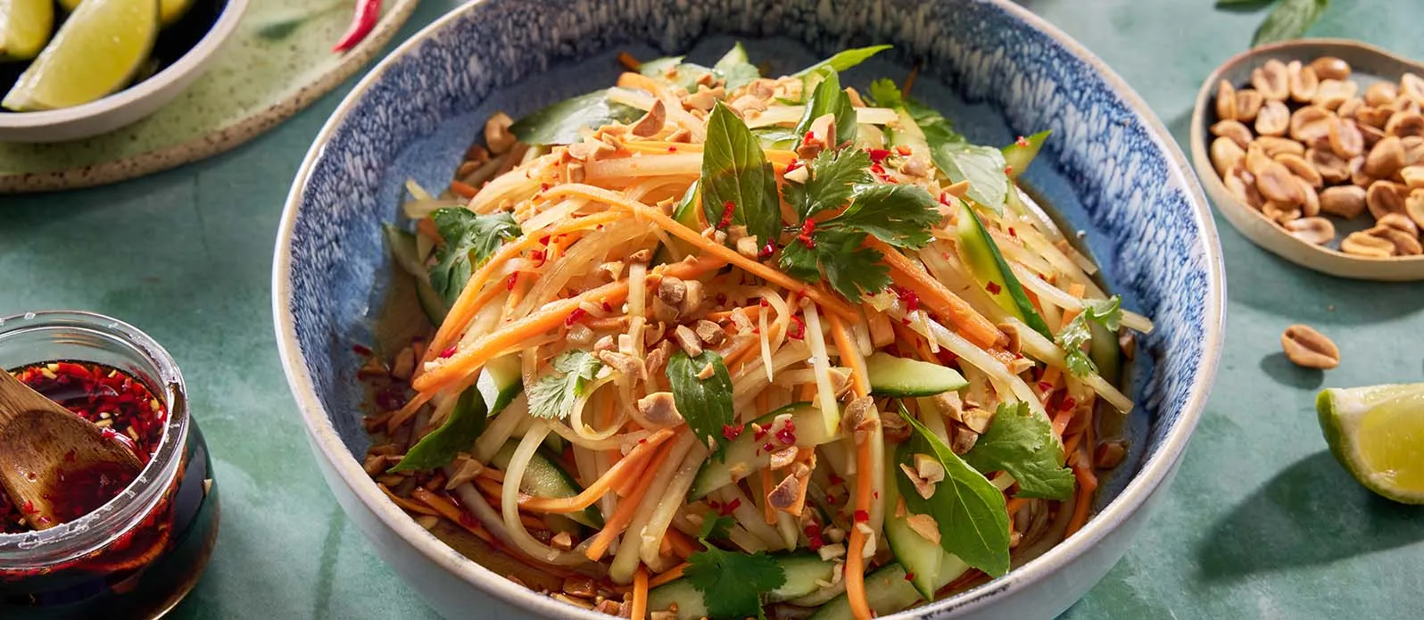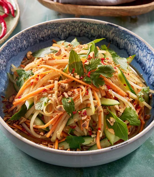 Ein leichter, erfrischender Salat von grüner Papaya nach thailändischer Art mit einem Dressing aus Kikkoman Ponzu Zitrone und Palmzucker, garniert mit knackigen Erdnüssen, Koriander und Basilikum für den aromatischen Genuss.