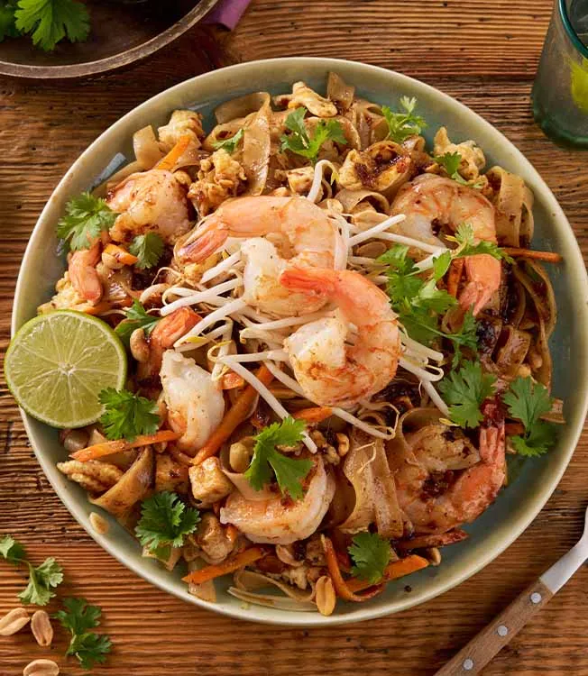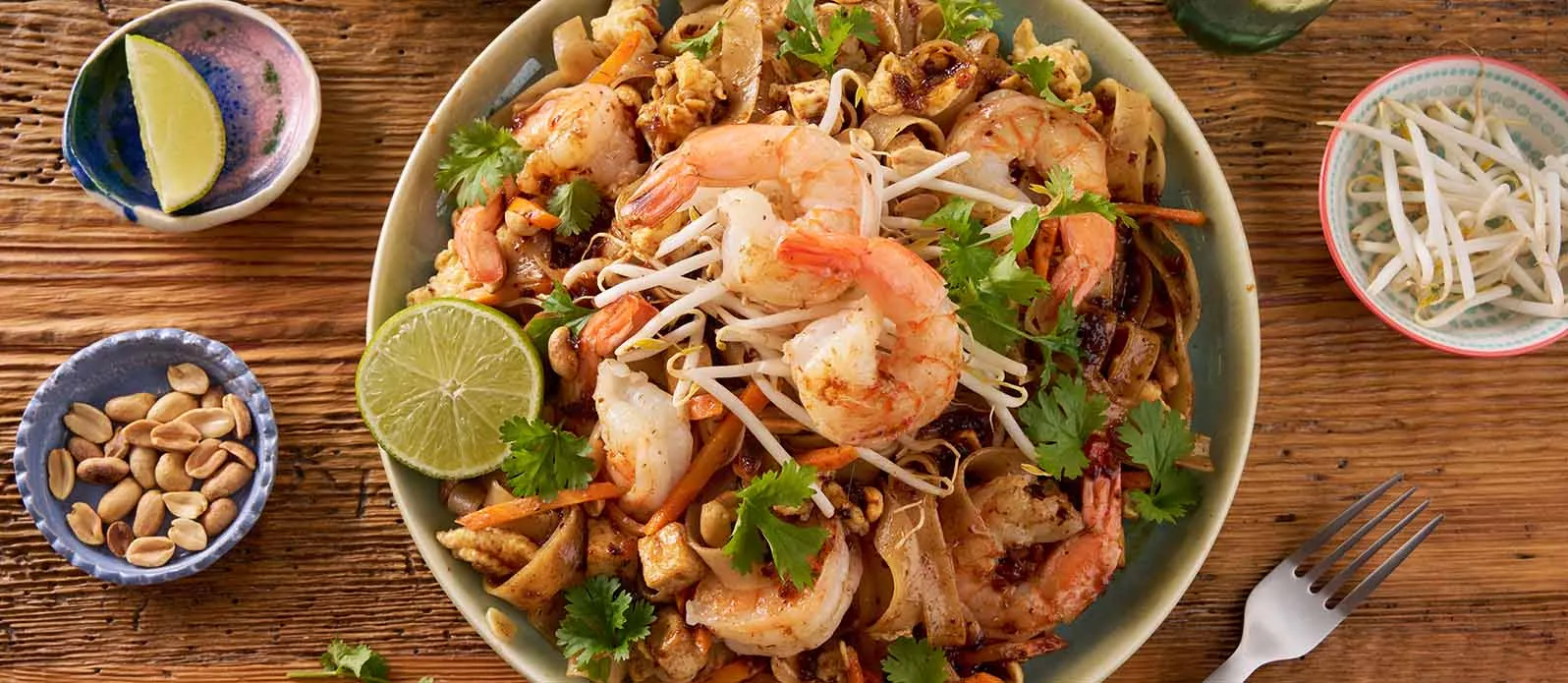 Herzhaftes Pad Thai mit Garnelen, Tofu und frischem Gemüse in einer aromatischen Marinade aus Tamarindenpaste und Kikkoman salzreduzierter Sojasauce. Sanft süß-sauer mit Umami-Tiefe und angenehmem Biss.