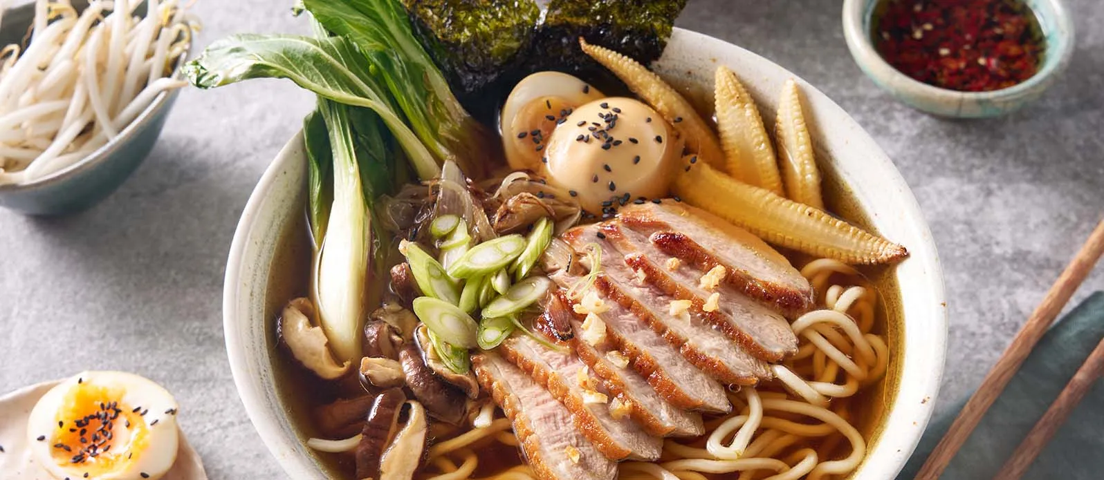Ramen-Nudeln separat gemäß Packungsanweisung kochen. Haut der Entenbrust kreuzweise einschneiden, Fleisch mit der Hautseite nach unten in eine kalte Pfanne legen und das Fett bei geringer Hitze langsam auslassen. Ca. 6 Minuten auf der Haut braten. Umdrehen und ca. 2 Minuten weiterbraten. Anschließend 8–10 Minuten bei 160 °C Ober-/Unterhitze im Ofen garziehen lassen. Kurz ruhen lassen, dann in Scheiben schneiden.