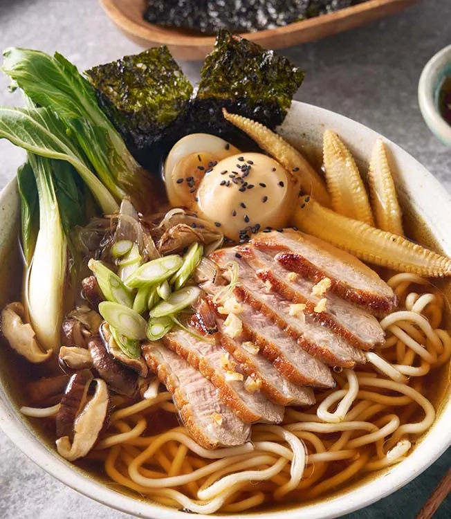 Rapsöl in einer Pfanne erhitzen und Shiitake-Pilze, Pak Choi und Mais 3–4 Minuten anbraten. Dabei gelegentlich schwenken. Die Ramen-Nudeln in eine Schüssel geben. 2–3 EL Shoyu-Tare und Kikkoman Sesamöl hinzufügen. Eine Portion der heißen Brühe hinzugießen. Das Gemüse hinzufügen, dann die Entenscheiben darauflegen und mit dem Ei garnieren. Mit Frühlingszwiebeln und Nori servieren.