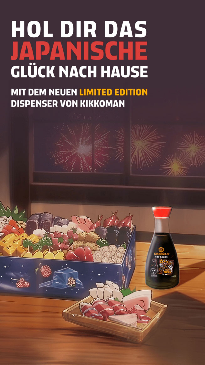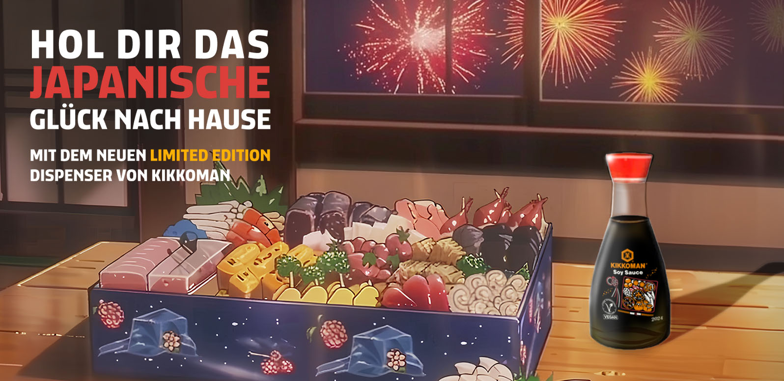 Eine solche Box, gefüllt mit Osechi-ryōri, ziert den neuen Limited Edition Dispenser von Kikkoman! Auch Kikkoman Sojasauce ist untrennbar mit der japanischen Geschichte verbunden – und verleiht japanischen und europäischen Festtagsgerichten das perfekte Aroma.