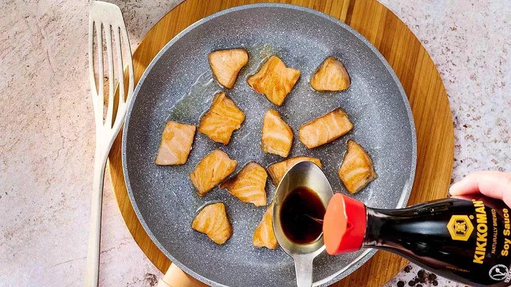 Öl in einer kleinen Pfanne erhitzen, den Lachs darin ca. 3 Minuten scharf anbraten und mit Kikkoman Sojasauce und Pfeffer würzen.