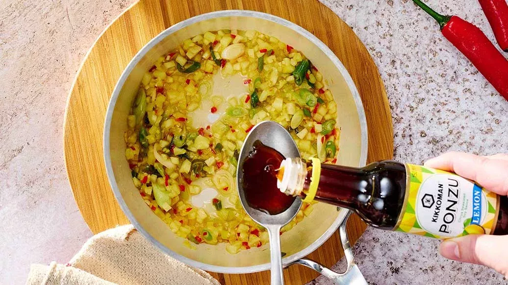100 g Ananasfruchtfleisch – 1 Frühlingszwiebel – 1 kleine rote Chilischote – 1 Knoblauchzehe – 1 cm kleines Stück Ingwer (ca. 1 cm) – 1 EL Pflanzenöl – 1 EL Zucker – 1 EL Weißweinessig – 4 EL Kikkoman Ponzu - Würzsauce mit Sojasauce und Essig, mit Zitronengeschmack