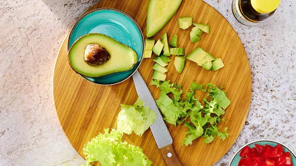 30 g Rotkohl – 3 Salatblätter – 1 kleine Tomate – 100 g Avocado