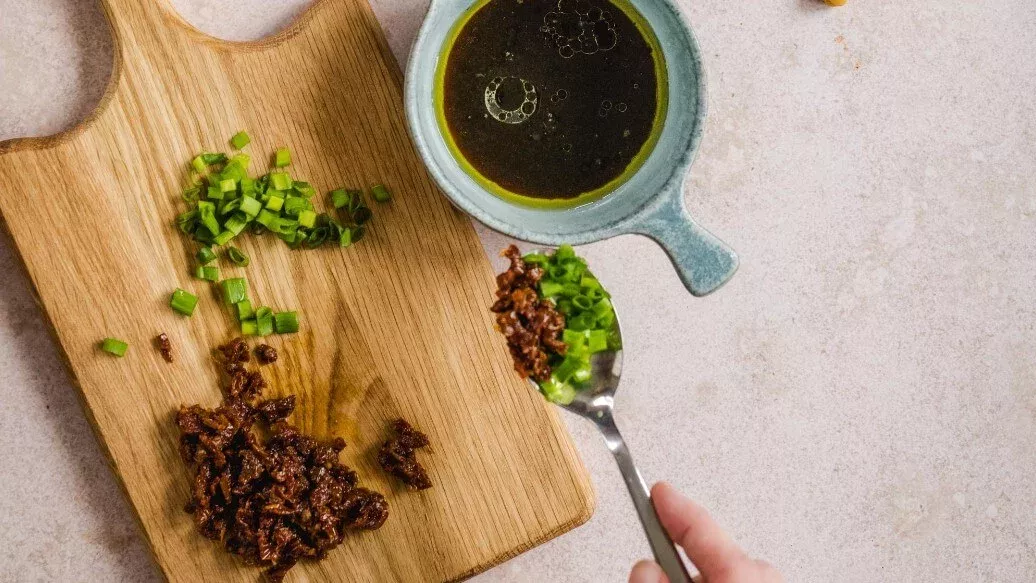 1 EL Kikkoman natürlich gebraute Sojasauce – 1 EL Olivenöl – 2 EL Limettensaft – 2 EL sonnengetrocknete Tomaten in Öl – 1 EL gehackter Schnittlauch – 2 EL Cashewkerne zum Bestreuen – Petersilie zum Garnieren