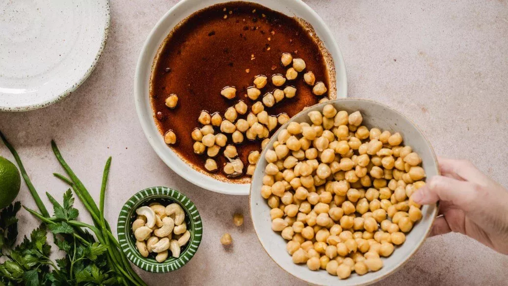 Bowl mit karamellisierten Teriyaki-Kichererbsen