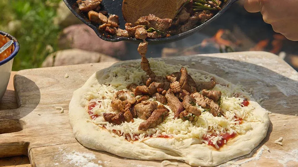 Den Pizzateig ausrollen. Mit der Sauce aus Schritt 2 bestreichen und mit Mozzarella bestreuen. Das Schweinefilet und die Basilikumblätter hinzufügen. Teig zu einer Calzone formen, Ränder umklappen und mit Olivenöl beträufeln.