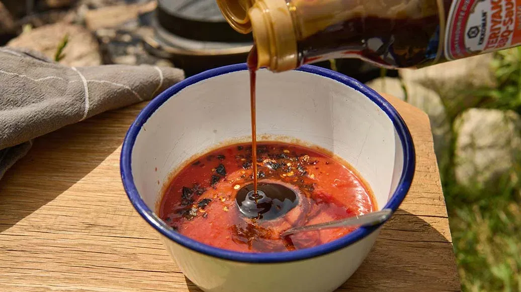 Tomatenpassata, Kikkoman Teriyaki Barbecuesauce Honig und Chipotle mischen.