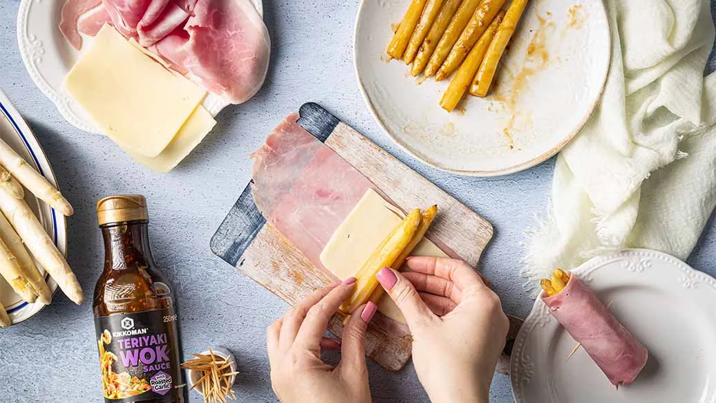 Eine frühlingshafte Variante des Cordon bleu. Weißer Spargel, mariniert in Kikkoman Teriyaki Wok Sauce Knoblauch, umwickelt mit Schinken und Käse und knusprig umhüllt von Kikkoman Panko. Dazu ein schneller Dip aus Kikkoman Ponzu Zitrone und Mayo.