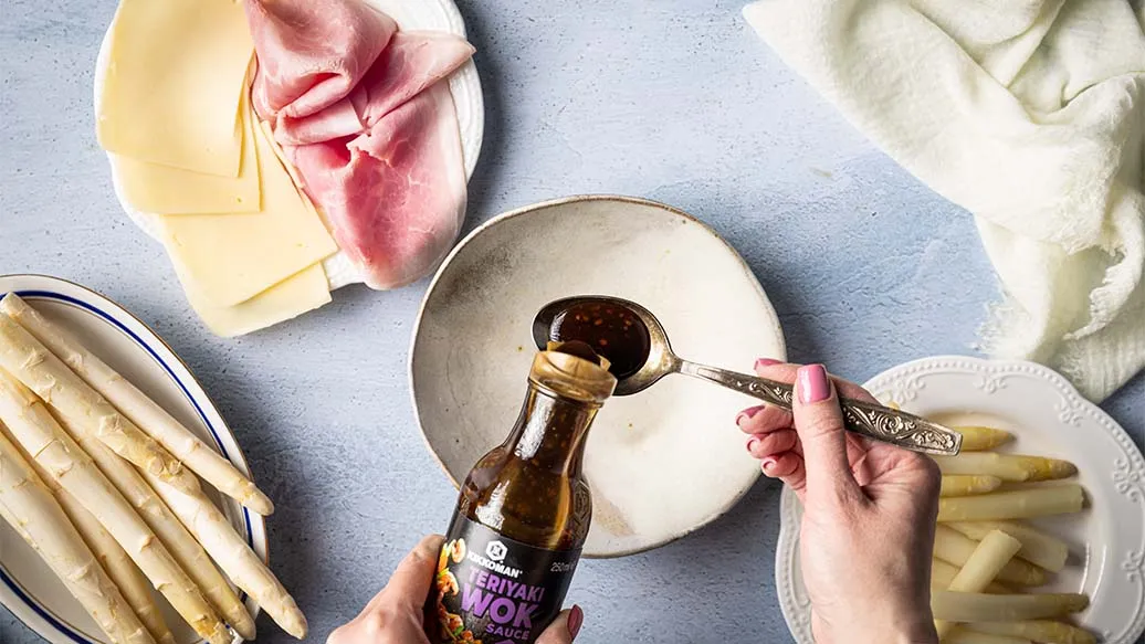 400 g weißer Spargel – 750 ml Wasser – ½ TL Salz – 2 EL Kikkoman Teriyaki Wok Sauce mit geröstetem Knoblauch