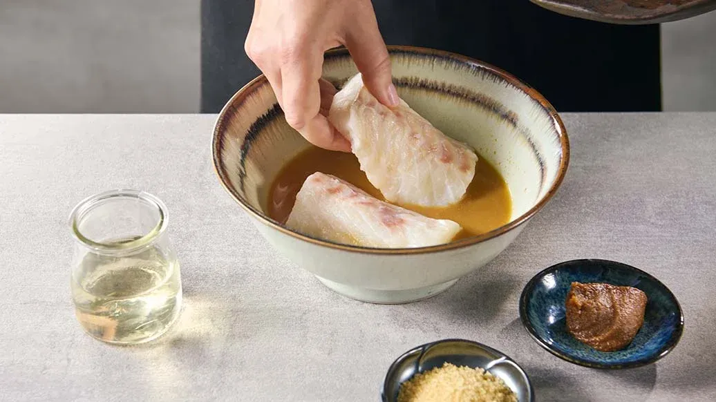 300 g Kabeljau-Loin – 80 ml Sake – 30 g helle Miso-Paste – 10 g brauner Zucker
