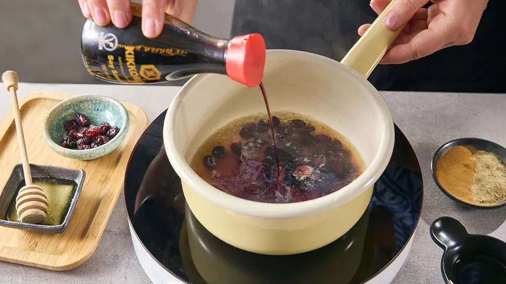 50 g Cranberries – 120 ml Pflaumenwein – 50 ml Kikkoman natürlich gebraute Sojasauce – 30 g Honig – 1 Prise Zimt – 1 Prise Kardamom
