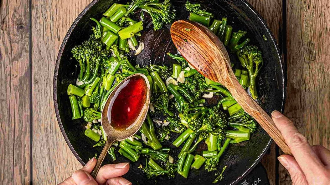 150 g Bimi®-Brokkoli – 2 EL Olivenöl – 1 Knoblauchzehe – 1 EL Kikkoman Ponzu - Würzsauce mit Sojasauce und Essig, mit Zitronengeschmack