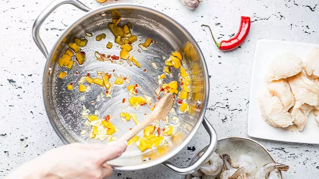 Petersilie oder Koriander hacken. Shrimps abspülen und Schwänze entfernen. Kabeljau in dicke Würfel schneiden.