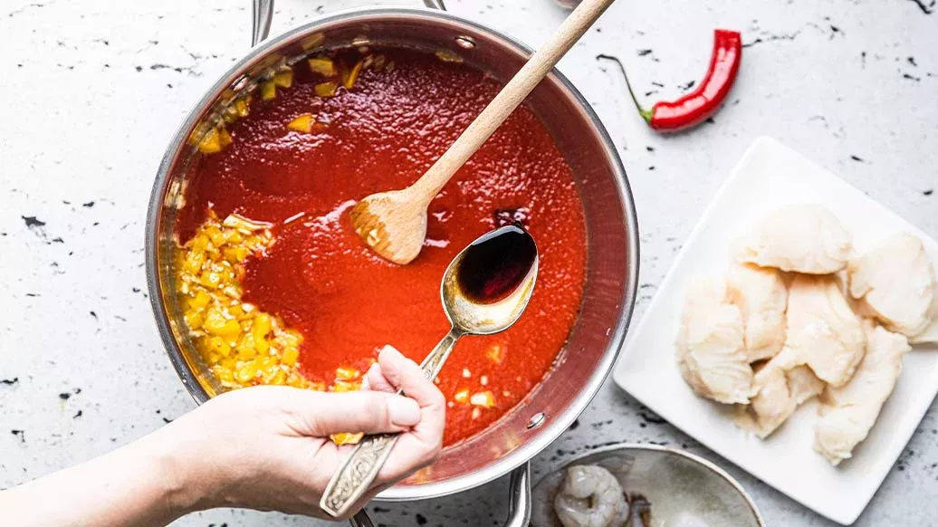 Eine reichhaltige, cremige Tomatensuppe mit zartem Kabeljau und saftigen Shrimps – wärmend, sättigend und voller köstlicher Aromen.