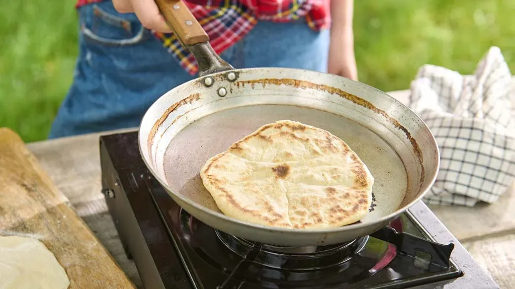 Mehl, Salz und Backpulver in einer Rührschüssel vermischen. Den griechischen Joghurt und das Olivenöl dazugeben und gut verrühren, bis ein Teig entsteht. Wenn der Teig zu klebrig ist, nach und nach mehr Mehl zugeben. Auf einer leicht bemehlten Fläche etwa 5 Minuten lang kneten, bis der Teig glatt ist. Den Teig in zwei gleich große Portionen teilen und jede Portion zu einer Kugel formen. Jede Kugel zu einem dünnen runden Fladen ausrollen. Eine Pfanne auf mittlerer Stufe erhitzen und leicht mit Olivenöl benetzen. Jedes Fladenbrot 2 bis 3 Minuten von beiden Seiten goldbraun backen, bis der Teig gar ist. Beiseitestellen.
