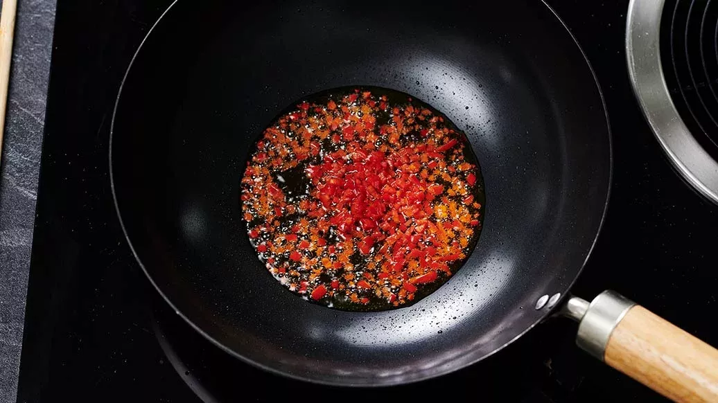 Chili in 1 EL erhitztem Öl im Wok anbraten und herausnehmen.