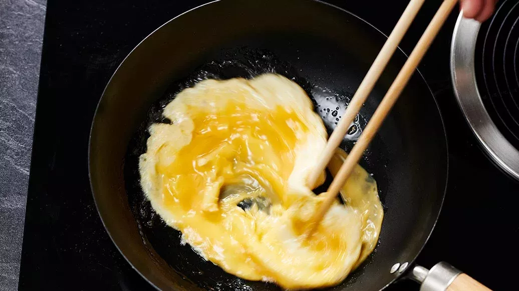 Verquirlte Eier in 1 EL erhitztem Öl im Wok braten, herausnehmen und den Wok nochmals säubern.