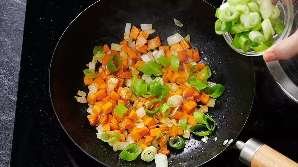Karotte und Zwiebel mit 1 EL Öl in das verbliebene Bratfett der Chili geben und ebenfalls anbraten. Frühlingszwiebeln zufügen, dünsten bis sie glasig werden und alles herausnehmen.