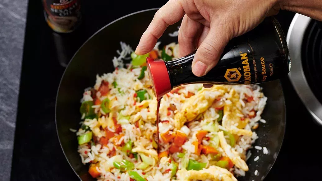 Das gebratene Gemüse zufügen und kurz mitbraten. Das Ei unterheben und alles mit Kikkoman Sojasauce und Kikkoman Sesamöl verfeinern.