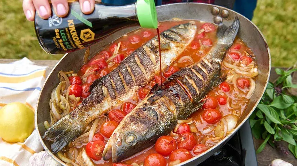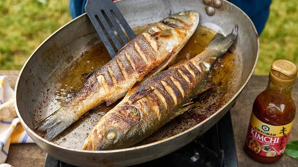 2 ganze Wolfsbarsche, je ca. 350 g – 3 EL Kikkoman scharfe Chilisauce für Kimchi