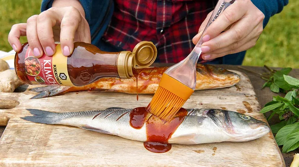 Den ausgenommenen Fisch von den Schuppen befreien, waschen und abtrocknen. Die Haut auf beiden Seiten mehrfach schräg mit einem Messer einritzen, mit Kikkoman Chilisauce Kimchi bestreichen und den Fisch beiseitestellen.