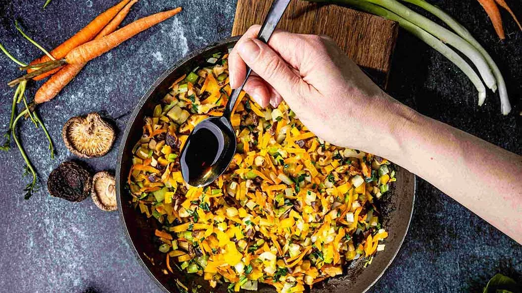 Das Gemüse in Kikkoman Sesamöl anbraten, dann die gehackten Pilze und Kikkoman Sojasauce hinzufügen. Unter ständigem Rühren ein paar Minuten braten, bis das Gemüse weich ist. Zum Abkühlen beiseitestellen.