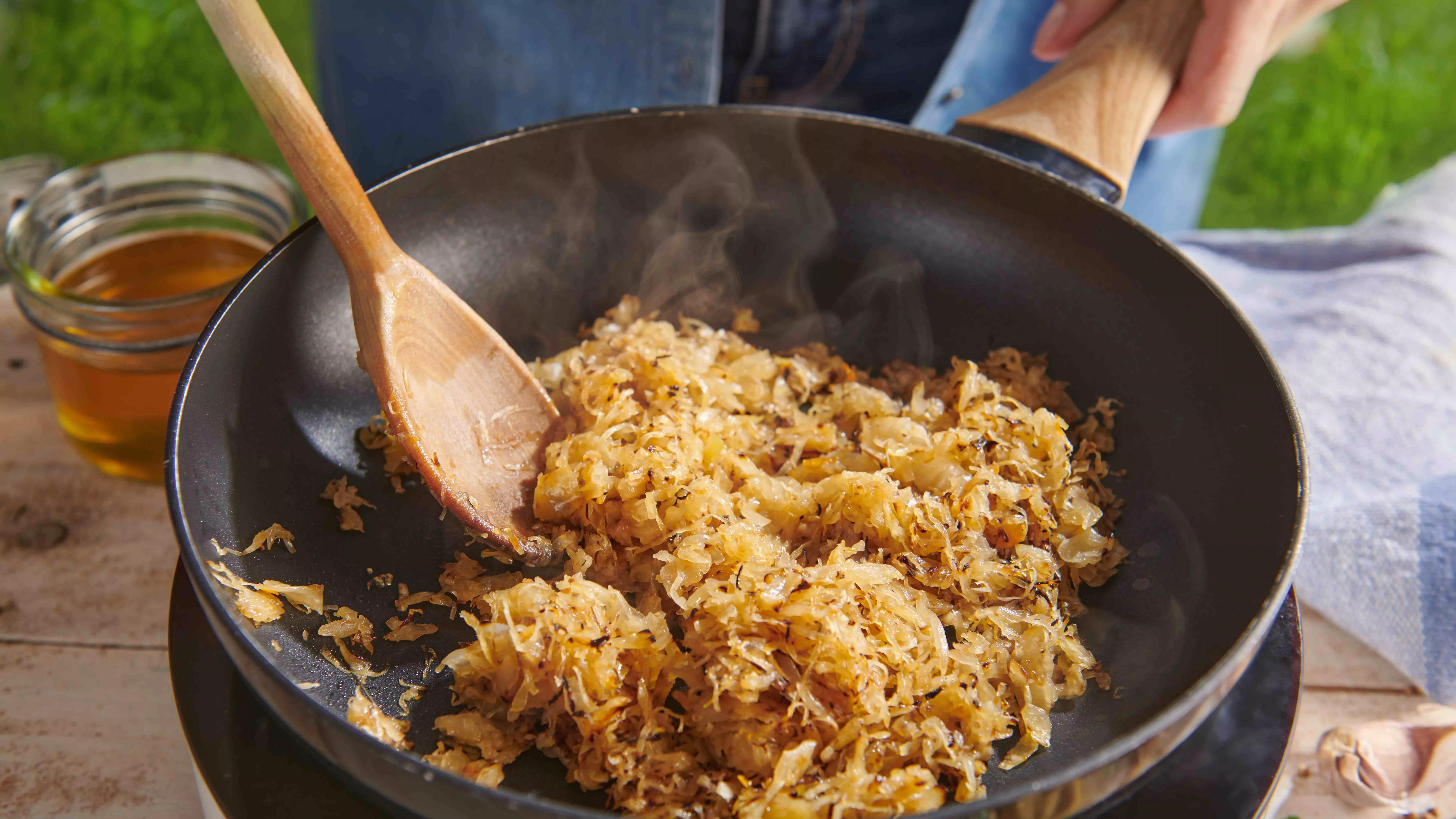 Das Sauerkraut mit Senf und Honig vermischen und in einer Pfanne anbraten. Die Fleischscheiben mit dem gebratenen Sauerkraut und der in Scheiben geschnittenen Gurke auf dem mit Senf bestrichenen Brot servieren.