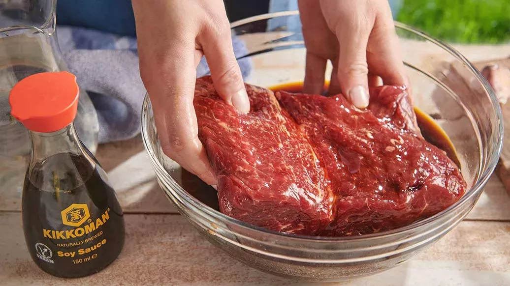 1 Becher brauner Zucker – 180 g brauner Zucker – 250 ml Kikkoman natürlich gebraute Sojasauce – 100 ml Kikkoman süße Würzsauce zum Kochen nach Mirin-Art – 250 ml Wasser – 400 g Rinderlende (oder Rinderbrust)