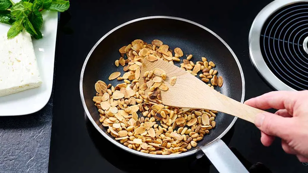 Mandelblättchen und Pinienkerne in einer kleinen beschichteten Pfanne ca. 3 Min. goldbraun rösten. Feta zerbröseln.