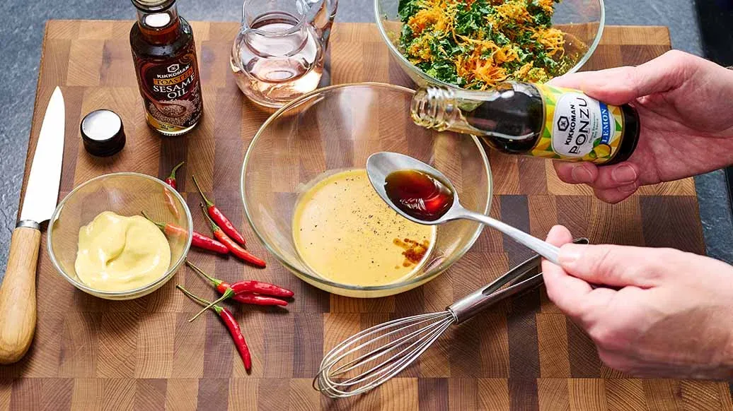 ½ kleine rote Chilischote – 3 EL Kikkoman Ponzu - Würzsauce mit Sojasauce und Essig, mit Zitronengeschmack – 2 EL Kikkoman geröstetes Sesamöl – 1 EL Rotweinessig – 1 TL Dijonsenf – 1 TL Agavendicksaft (alternativ: Honig, Ahornsirup, brauner Zucker) – Pfeffer aus der Mühle