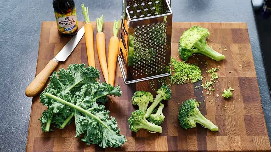 Grünkohl, Brokkoli und Möhren sehr fein raspeln oder reiben.