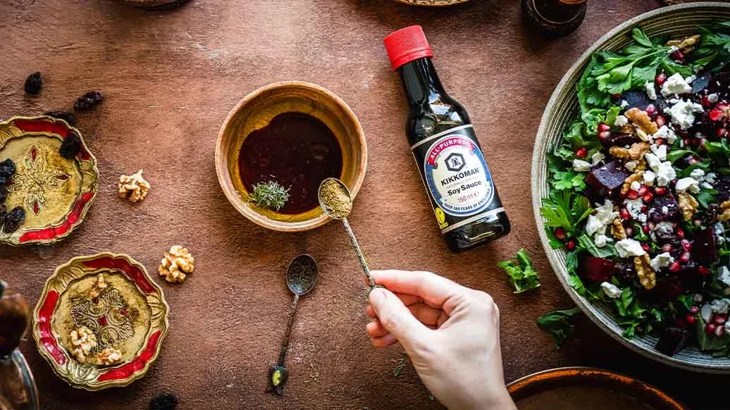 1 EL Olivenöl – 2 EL Kikkoman natürlich gebraute Sojasauce – 1 EL Agavensirup – 1 EL Zitronensaft – 1 TL getrockneter Thymian – 1 TL gemahlener Kreuzkümmel