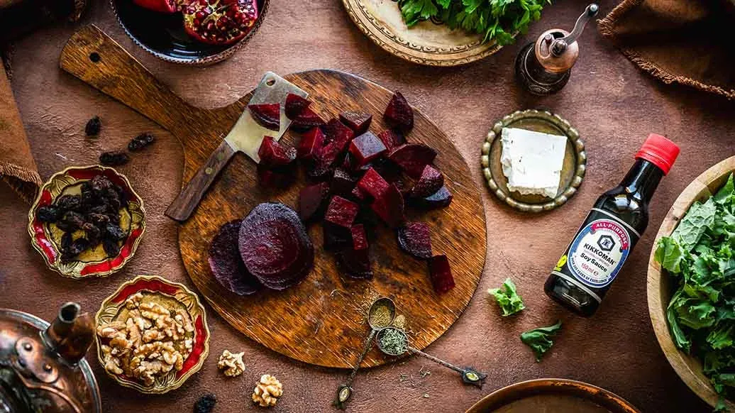 Dieser farbenfrohe Salat ist vom Nahen Osten inspiriert, mit gerösteter Rote Beete, Grünkohl, süßen Rosinen und Granatapfelkernen. Abgerundet mit Walnüssen, Feta und einem Thymian-Soja-Dressing ein köstliches Gericht für jede Jahreszeit.
