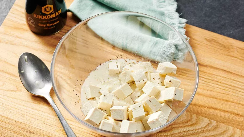 Für den veganen Feta den Tofu in Würfel schneiden, mit dem fein gehackten Knoblauch und den übrigen Zutaten für die Marinade vermengen. Bis zur Verwendung kalt stellen.