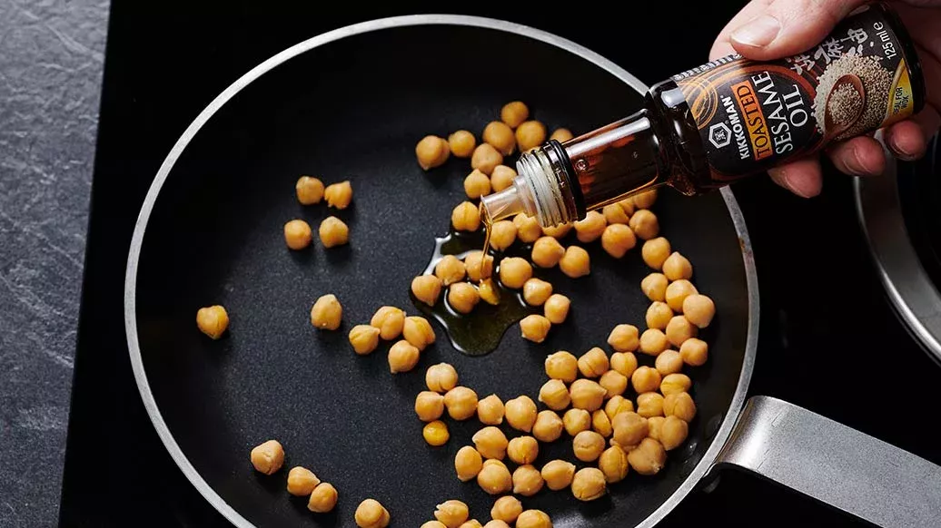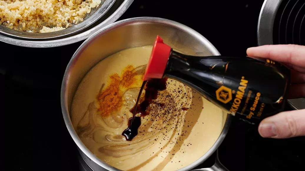 Für die Sauce 150 g Kichererbsen mit etwas Limettenabrieb, evtl. etwas -saft und der Kokosmilch pürieren, erhitzen, mit der Tahini, der Kikkoman Sojasauce, Pfeffer und dem Kurkuma abschmecken.