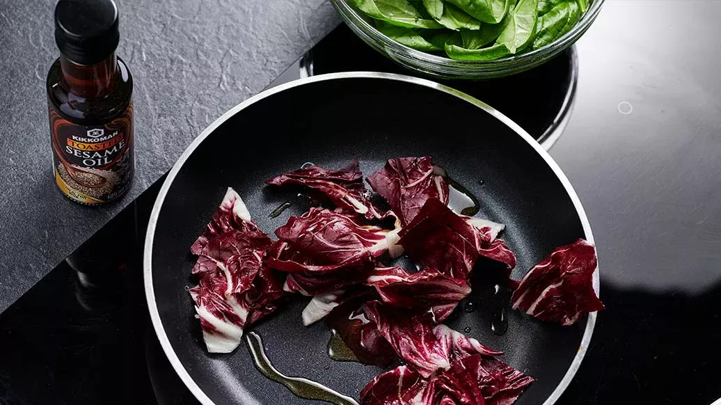 Den Bulgur nach Packungsanweisung zubereiten. Den Mangold in Streifen schneiden und in 1 TL erhitztem Kikkoman Sesamöl andünsten. Mit dem Spinat wiederholen.