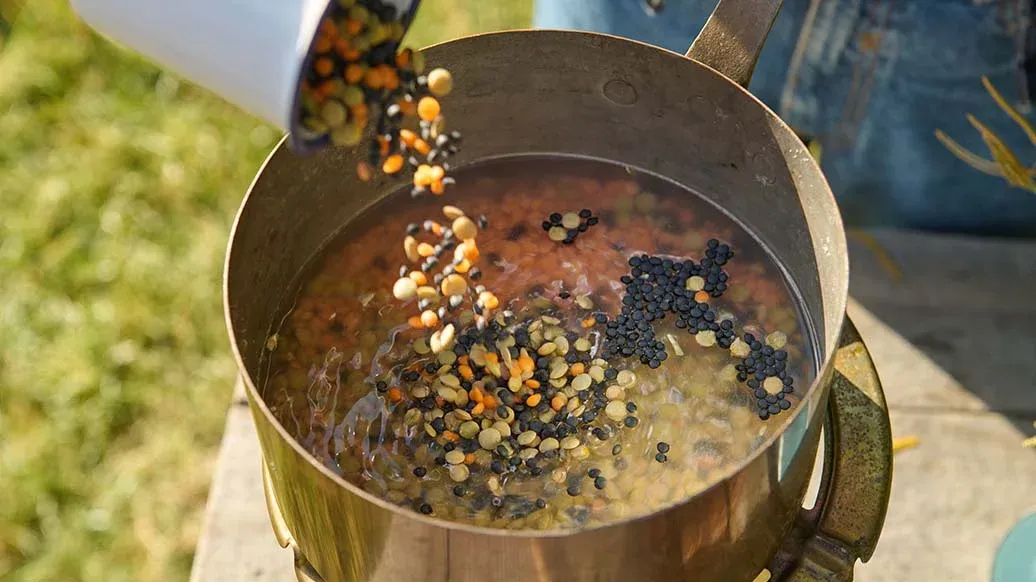 150 g gemischte Linsen (z. B. rote, grüne und gelbe Linsen), abgespült – 400 ml Gemüsebrühe oder Wasser