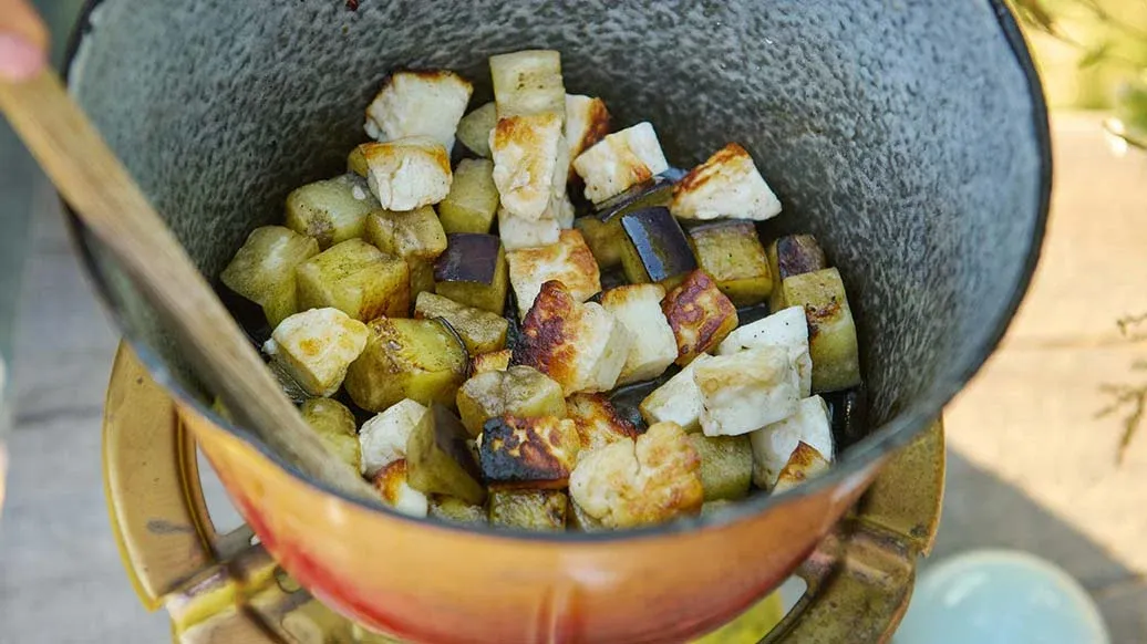 1 kleine Aubergine, gewürfelt – 100 g Halloumi-Käse, gewürfelt – 1 EL Olivenöl