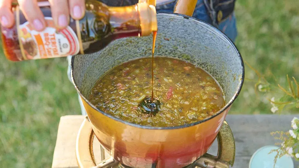 Das Öl in dieselbe Pfanne geben und die Zwiebel 3 bis 4 Minuten braten, bis sie weich und glasig ist. Knoblauch und Ingwer einrühren und weitere 1 bis 2 Minuten braten, bis sie duften. Tomate, Kreuzkümmel, Koriander, Kurkuma und Chilipulver in die Pfanne geben. Unter ständigem Rühren 2 bis 3 Minuten dünsten, bis die Gewürze geröstet sind und duften. Die Linsen zusammen mit der restlichen Kochflüssigkeit in die Pfanne geben. Umrühren, damit sie sich gut mit den Gewürzen vermischen. Mit Kikkoman Teriyaki Barbecuesauce Honig und Kikkoman Sojasauce würzen und weitere 5 bis 10 Minuten köcheln, damit sich die Aromen verbinden. Das Dal in Schalen anrichten und mit Aubergine, Halloumi und Koriander garnieren.