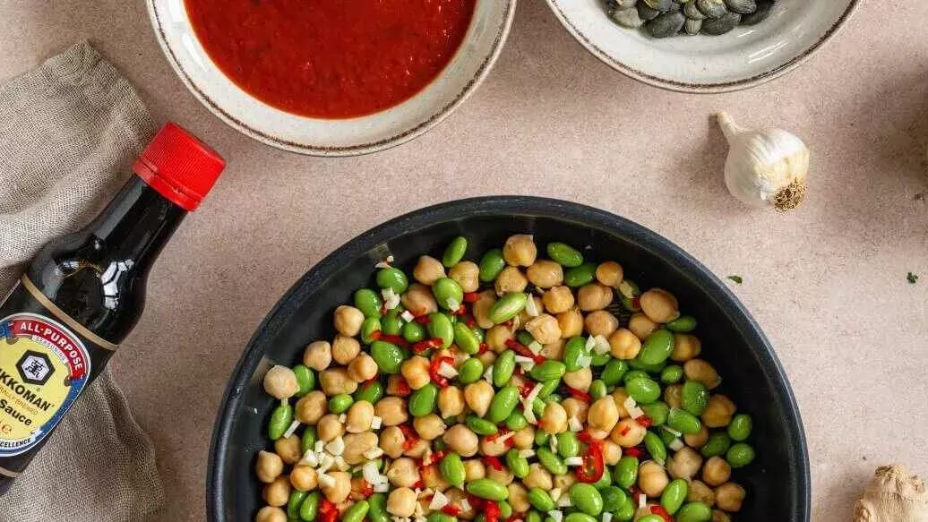 Olivenöl in einer Pfanne erhitzen und darin die Kichererbsen und Edamame zusammen mit dem fein gehackten Knoblauch, Ingwer und Chili anbraten. Wenn das Gemüse goldbraun ist, mit der Sauce anrichten.