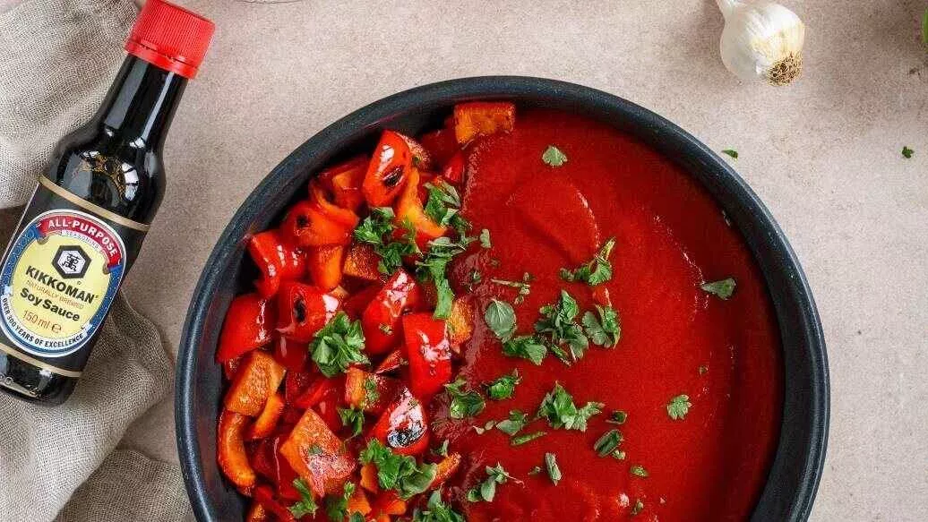 Die gewürfelten Paprikaschoten in Olivenöl anbraten. Sobald die Haut dunkel wird, die Kräuter und die Tomatenpassata dazugeben. 10 Minuten köcheln lassen. Dann mit Kikkoman Sojasauce und Pfeffer abschmecken und zu einer glatten Sauce pürieren.