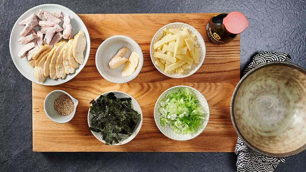 Bambussprossen abgießen. Lauchzwiebeln und Seetang in dünne Scheiben schneiden. Ingwer schälen und in 4 dünne Scheiben schneiden (eine pro Teller). Sesam in einer Pfanne unter Rühren goldgelb anrösten. Schweinebraten und Hähnchenbrust in Scheiben schneiden.