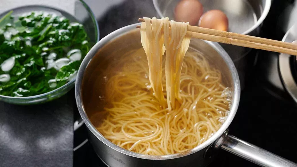 Nudeln bissfest kochen und abschrecken. Blattspinat 1 Sekunde blanchieren und in Eiswasser abschrecken. Eier anstechen, in kochendes Wasser geben und 6 Minuten wachsweich kochen. Abgießen und abschrecken.