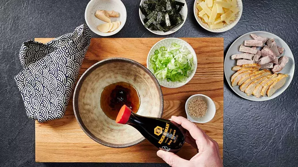 Je 1 Esslöffel Kikkoman Soja-Sauce und 1 Teelöffel Fischsauce in vorgewärmte Suppenschalen geben. Vorbereitete Einlage verteilen und mit kochend heißer Brühe auffüllen. Zum Schluss die Eier pellen, halbieren und je 1 halbes Ei dazusetzen, eventuell mit Pfeffer würzen.