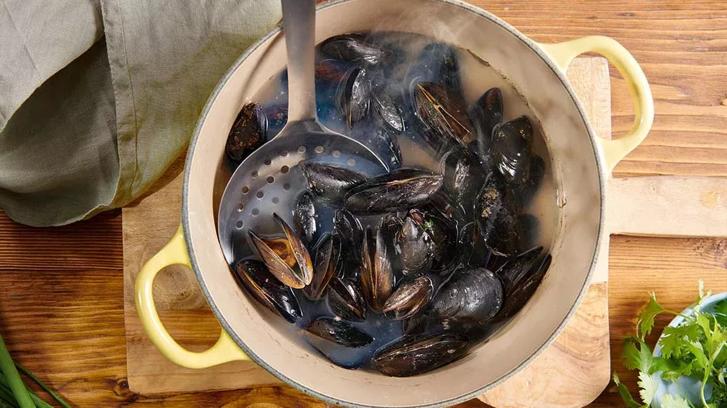 Wenn sich die Muscheln geöffnet haben (nach ca. 5 bis 7 Minuten), die Muscheln abgießen und 3 bis 4 Minuten abkühlen lassen.