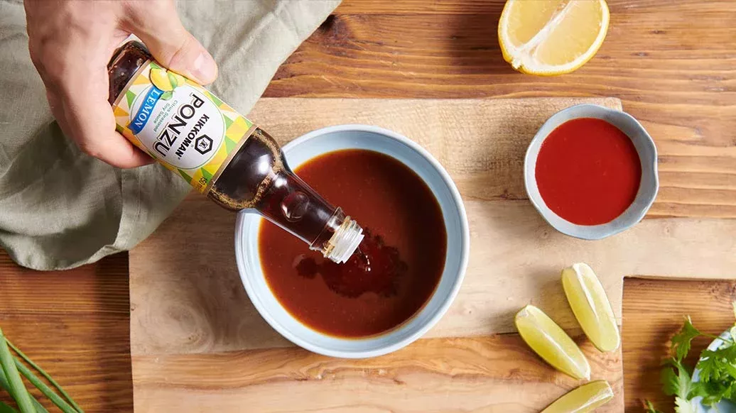 3 EL Kikkoman Ponzu - Würzsauce mit Sojasauce und Essig, mit Zitronengeschmack – 1 EL Sriracha – 1 EL Ketchup – ½ Limette – ½ Zitrone