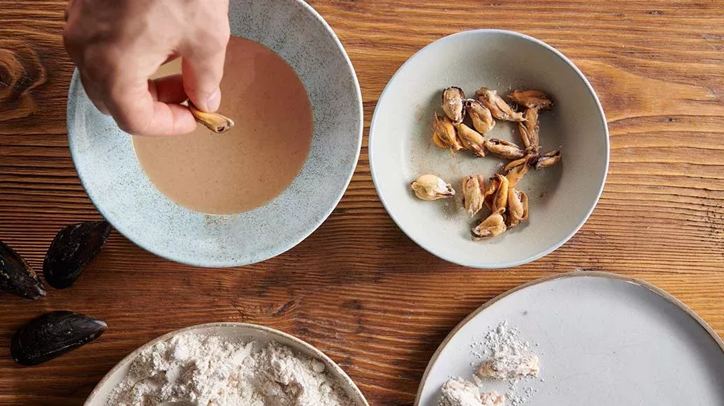 Die Muscheln im vorgewärmten Öl etwa 2 bis 3 Minuten frittieren, bis sie schön goldbraun sind.